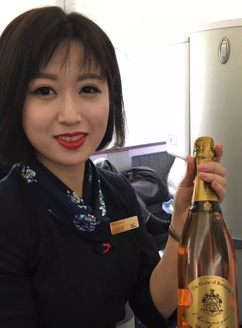 祝贺罗斯福品牌旗下的玫瑰香槟和波尔多葡萄酒被选为首飞航班的指定晚餐用酒